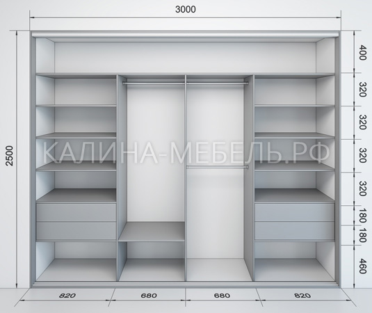 Заказчик сам указывает необходимое количество полок, вешалок, ящиков и сетчатых корзин.
